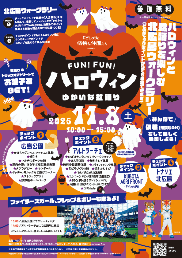 当日は、北広島市内の4つのエリア(広島公園・アルトラーチェ・Fビレッジ・トナリエ北広島)にチェックポイントが設置され、自由に回遊しながら体験・交流を楽しめます。仮装して参加すると「お菓子のプレゼント」も♬