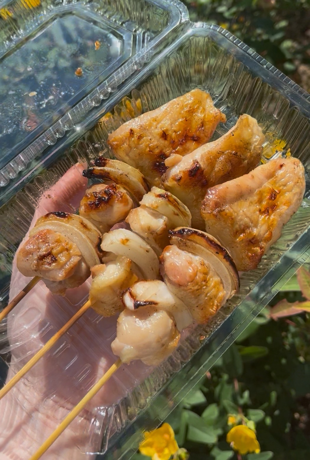 焼き鳥を買ったら、手元から香ばしい匂いがふわっと広がり、車の中まで幸せな香りに包まれます。